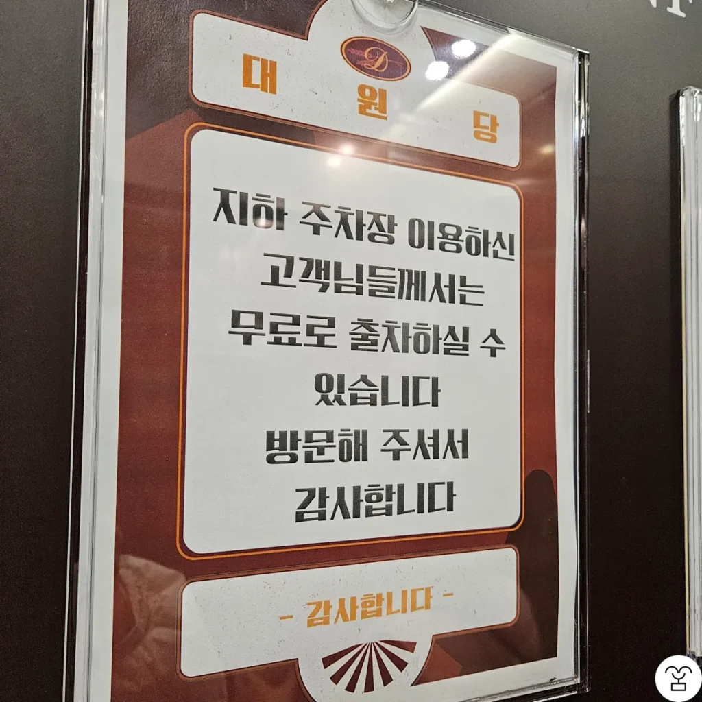 There is a parking lot on the basement level 1 of the Daewondang building. The entrance and exit lanes are only one lane each, so you need to be careful when going up or coming down. Since parking is free, no payment or validation is required.