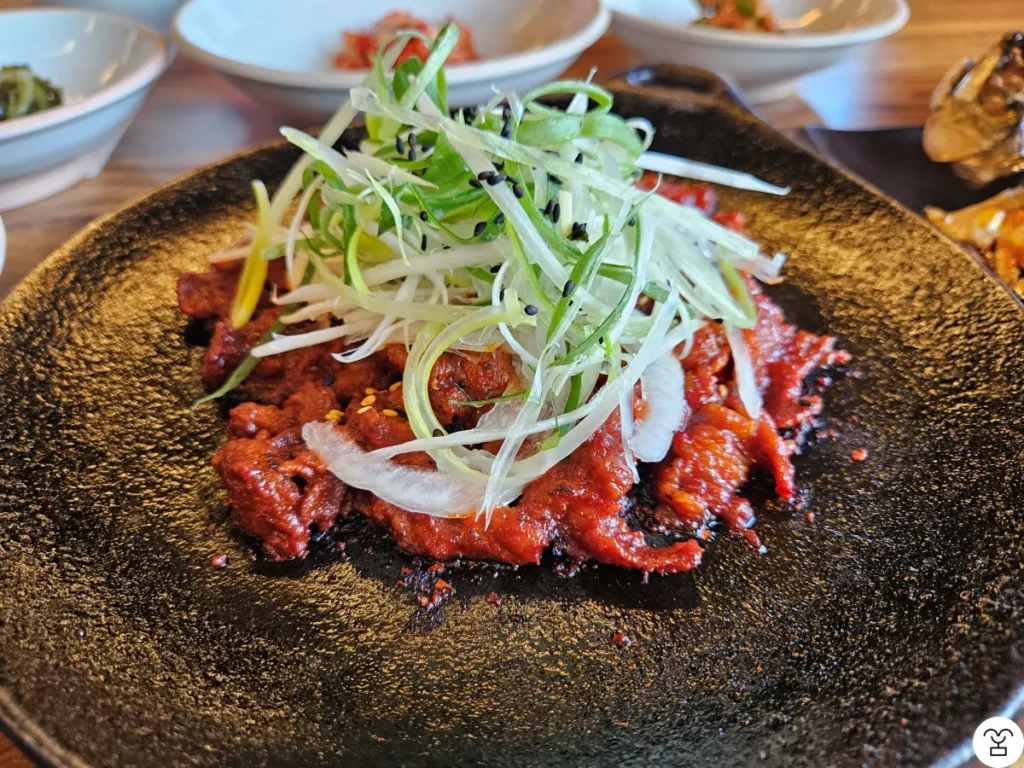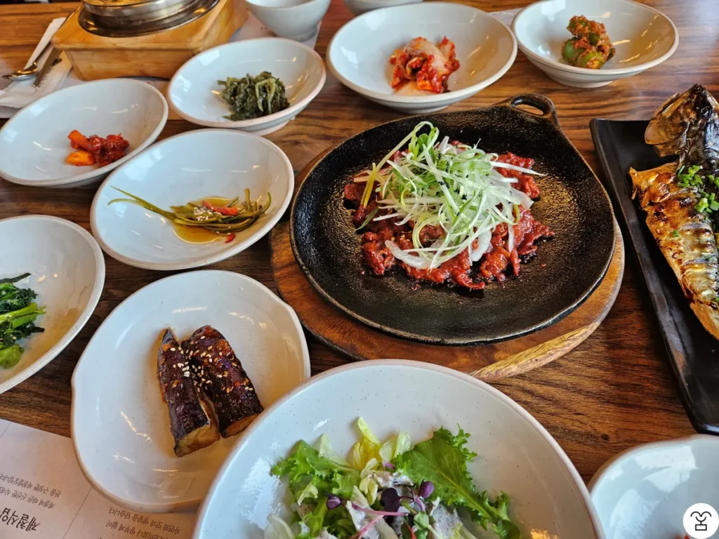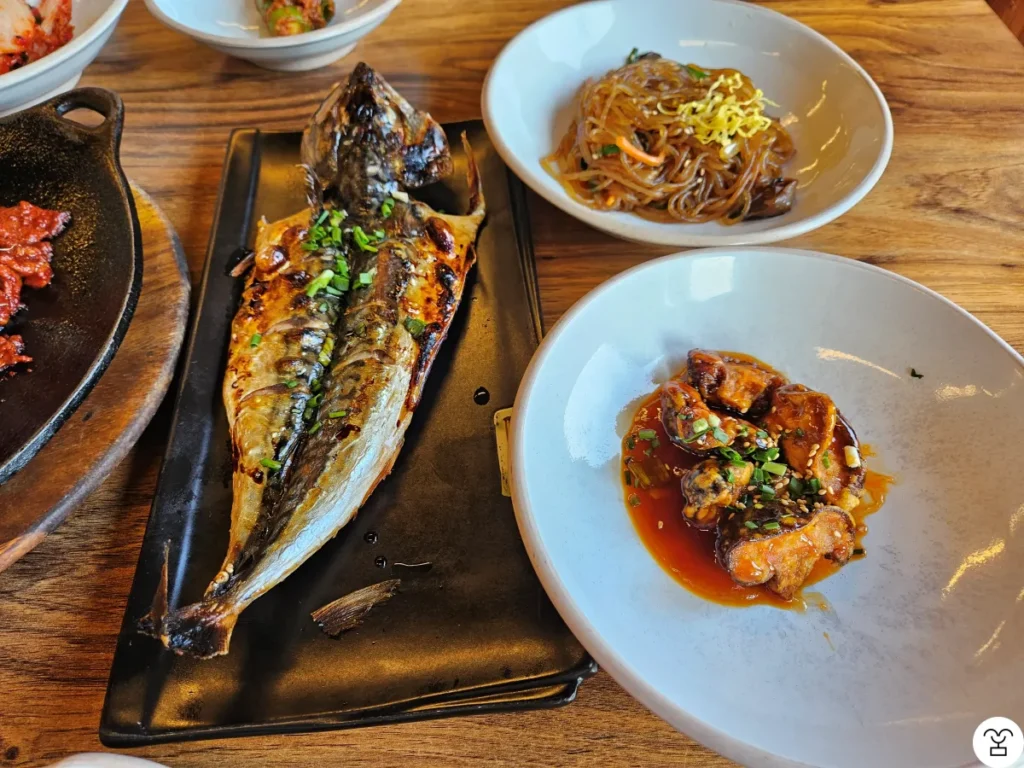 The Hae-jeongsik set costs 19,000 won per person. We ordered two servings. The set includes grilled pork with a charcoal flavor and grilled mackerel. The grilled pork was delicious. The only downside was that there were 2–3 live flies around the table. (Not from the food, though.)